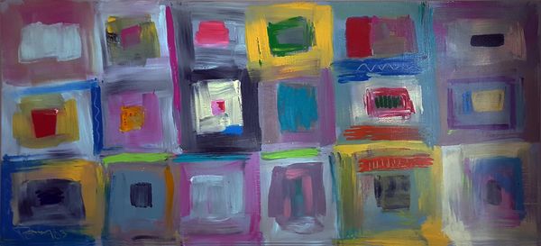 Acrylic on stretched canvas 60" x 60" x 3". A collector commissioned this piece with the caveat "I want it big and square with bright colors." I absorbed the atmosphere fro m his southwest location and the painting emerged with a Native American feel with the hint of turquoise. SOLD