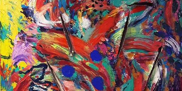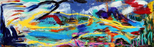 Mixed acrylic media on stretched canvas 48" x 96" x 2". One of the few pieces jointly created with Valerie during a time of peace and collaboration. $3000.
