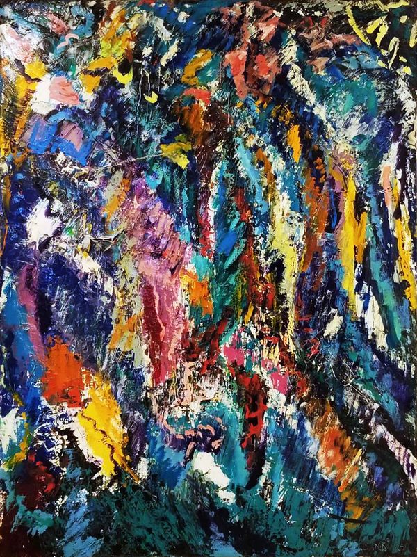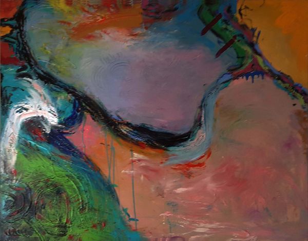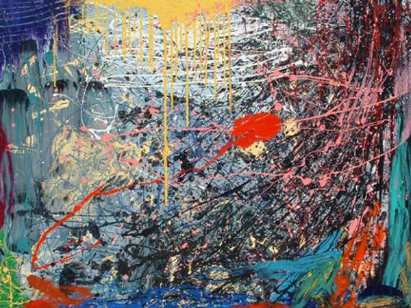 Acrylic on stretched canvas 66" x 44" x 2". My trapped psychic energy exploded onto this canvas which became heavy with paint. My collector had a replica stained glass window made for his front door as a prelude, when opened reveal this painting hanging over his mantel in the living room. SOLD