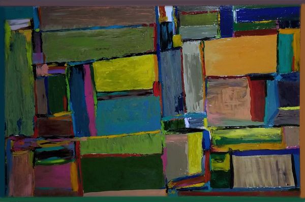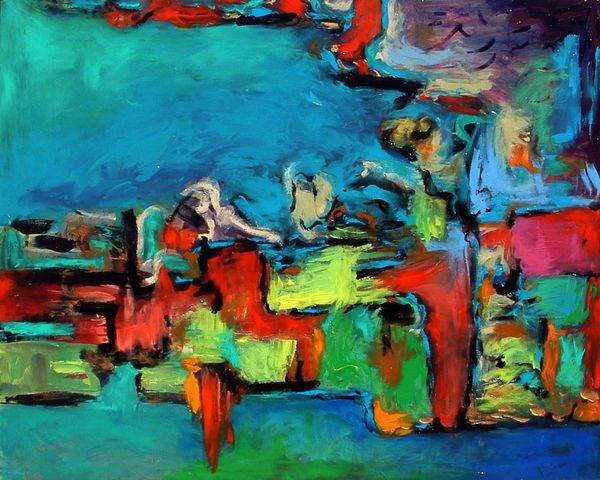 Acrylic over stretched canvas 61" x 42" x 2" (frame size). In the style of Hans Hofmann, this piece evolved from visceral memories of the colorful people and experiences in Moxey Town on Andros Island in the Bahamas. SOLD
