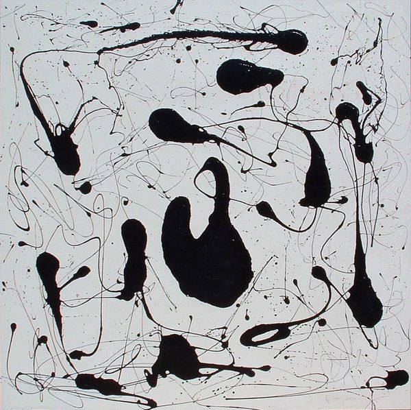 Black and white enamel on primed stretched canvas 60" x 60" x 2". Sometimes the titled for a painting pops into your head when you are creating it. This one done on the floor a la Jack the Dripper. SOLD