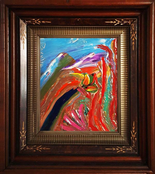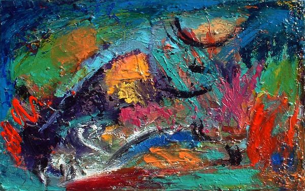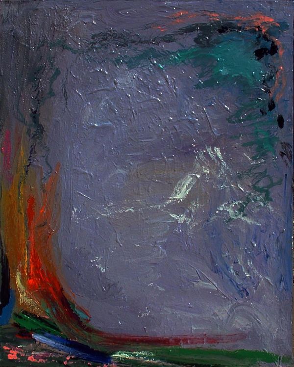 Acrylic, oil enamel,miscellaneous aggregate over plywood and frame 36" x 72" x 3". I painted this, then framed it and it didn't look finished, so I continued on and painted the frame. My dentist came to dinner one night and said he saw the face of a wizard in the painting. Abstract paintings can create a wonderful collaboration between the artist and the viewer. SOLD