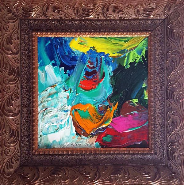 Framed acrylic on wood panel 10" x 10" x 1/4" (image size). If you have ever seen surfers ride the perilous 90-foot waves at Nazarre, Portugal, you too will be inspired to transform that feeling into a color-field of abstraction. SOLD