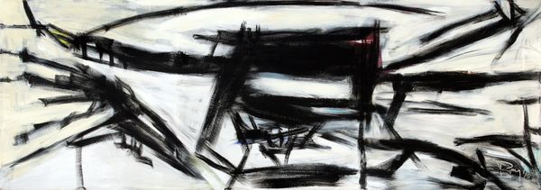 Acrylic on stretched canvas 61" x 27" x 1" (framed). This piece was a struggle for many hours as I tried to work out some inner demons. Finally, I let everything go and experienced a deep sense of inner peace. With supernatural clarity, I picked up a wide bush and completed the painting in several minutes, obfuscating the cacophony of underling colors with pure black and white. $2500.