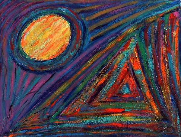 Acrylic on stretched canvas 36" x 48" x 2". Described by Plato and thought have exited in the Atlantic Ocean within the Bermuda Triangle, this sunken city of myth was said to have been powered by five giant crystals capable of transforming the sun's energy. I was told by a psychic in a seance at The Academy of Atlantis in L. A. my name was once Grendonis, keeper of the crystal. $1500.