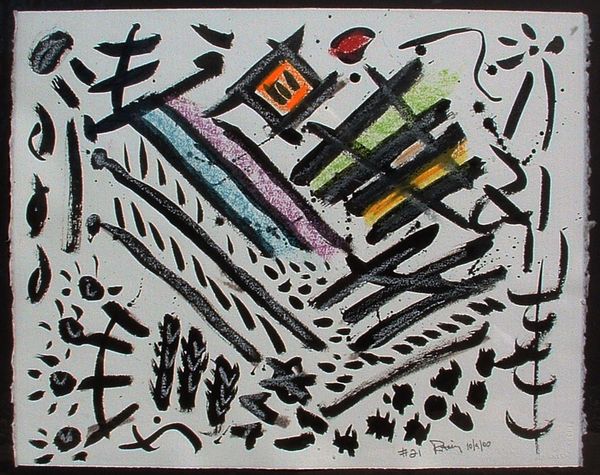 Gauche, India ink and oil crayon on heavy 100% cotton rag paper, 20" x 24". I did a series of these by suspending thought and working quickly, let inner psychic energy guide my hand. Nothing was covered up or painted over. In shadowbox frame $650.