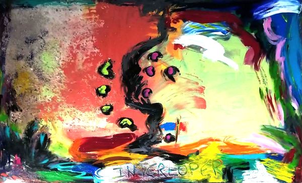 Acrylic and Styrofoam pellets on stretched canvas 24" x 48" x 2". Sometimes when painting you have no idea where you are going. Then, at a certain point, a word pops in your mind from the subconscious, one of the perils of reading the dictionary. An interloper is a person who becomes involved in a place or situation when they are not wanted or do not belong. $1500.